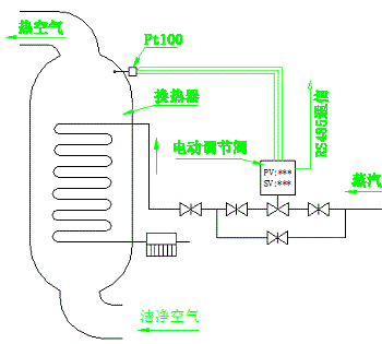 靜化空氣通過換熱器加熱后,將相對(duì)恒定的風(fēng)量送入培育室,要求送風(fēng)的溫度相對(duì)恒定。加熱源為蒸汽,采用集散控制方式,控制工作由溫控單元獨(dú)立完成,控制過程由中控系統(tǒng)實(shí)時(shí)監(jiān)控。